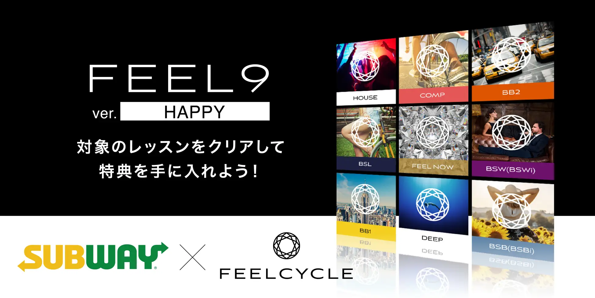 サブウェイのヘルシーなサンドイッチ6ヶ月分の無料券が当たるキャンペーン!FEELCYCLEのレッスン受講で参加できる「FEEL9 ver.HAPPY」を実施